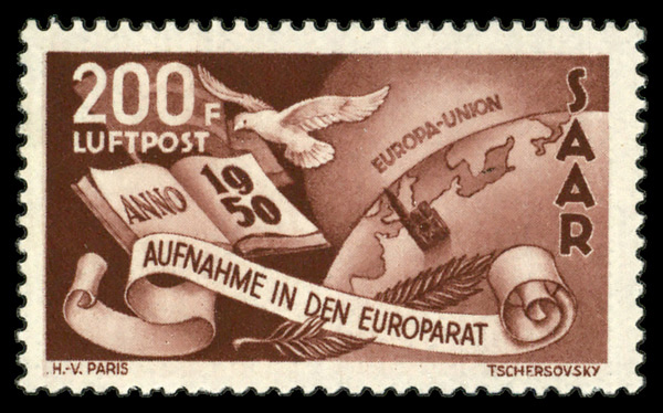 6127 nh C12 imageAirmail, 1950, 200fr Admission to the Council of Europe (Scott C12), single, o.g., never hinged, Fine to Very Fine.