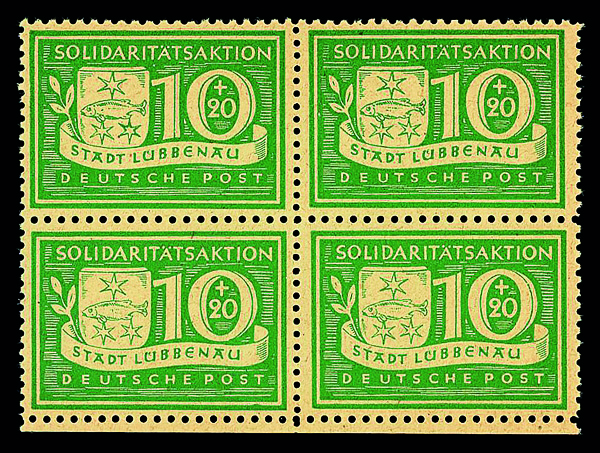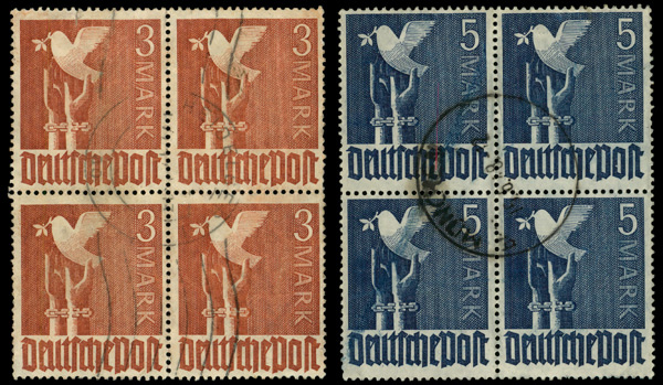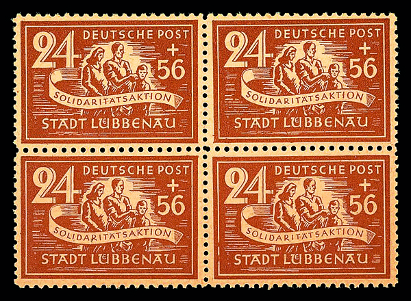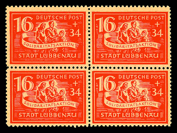 6137 nhbl 9-12 image1946, 10pf+20pf-24pf+56pf Solidarity Action, complete, set of 4, blocks of 4, o.g., never hinged, Fine to Very Fine.