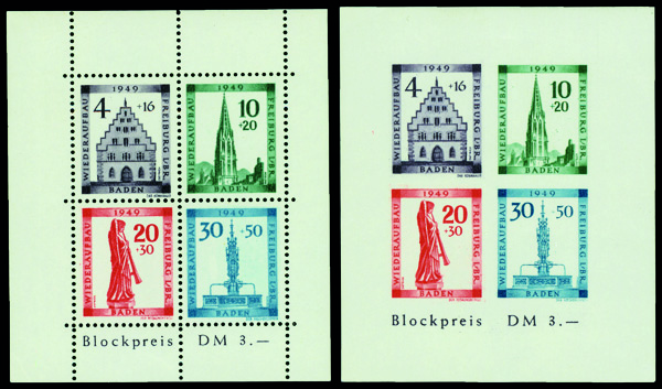 6143 nh 5NB8a-5NB8b image1949, Freiburg Reconstruction souvenir sheets of 4, perf. and imperf. complete (Scott 5NB8a-5NB8b), set of 2, o.g., never hinged, Extremely Fine.