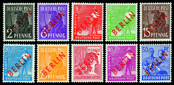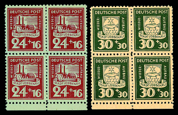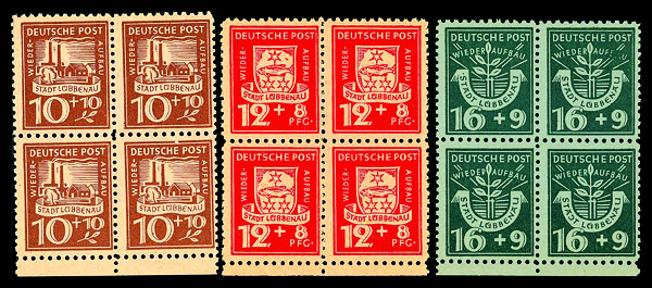 6136 nhbl 1-8 image1946, 5pf+5pf-30pf+30pf Reconstruction, complete, set of 8, blocks of 4, o.g., never hinged, Fine to Very Fine.