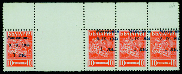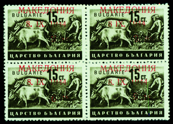 6133 nhbl 5 KW image1944, 9L on 15st Bulgaria, inverted '9' on overprint (Michel 5 KW), block of 4 error on LL stamp., o.g., never hinged, Fine to Very Fine, signed.