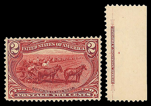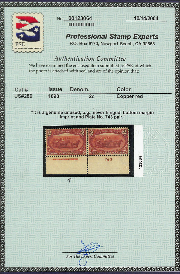 5086 nh 286 image1898, 2¢ Trans-Miss. (Scott 286), o.g., never hinged, Very Fine, with 2004 P.S.E. certificate for pair of which this is the left stamp.