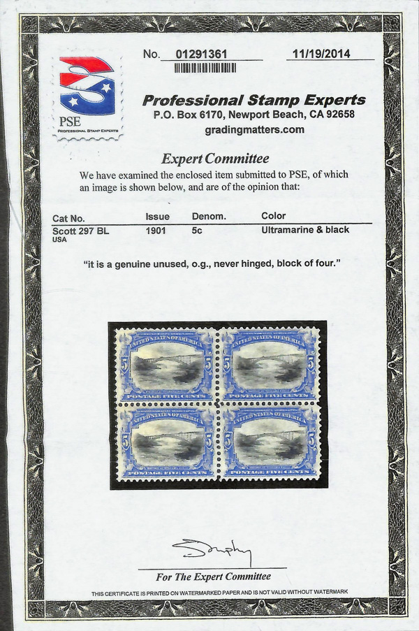5095 nh 297 image1901, 5¢ Pan-American (Scott 297), o.g., never hinged, Very Fine, with photocopy of 2014 P.S.E. certificate for block of which this is the UL stamp.