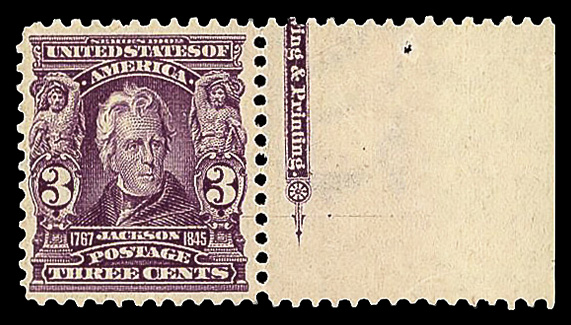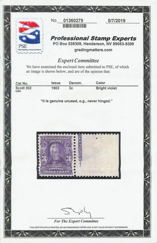 5098 nh 302 image1903, 3¢ bright violet (Scott 302), right margin single with part imprint, o.g., never hinged, Fine to Very Fine, with 2019 P.S.E. certificate.