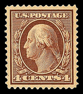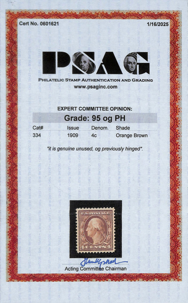 5117 og 334 image1908, 4¢ orange brown, D.L. watermark (Scott 334), o.g., barest trace of hinge (appears never hinged), Extremely Fine to Superb, with 2025 P.S.A.G. certificate graded XF-SUP 95.