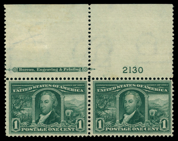 5109 nh 323 image1904, 1¢ Louisiana Purchase (Scott 323), top margin plate number and part imprint pair, clean example with "Bureau, Engraving & Printing." inscription & plate number 2130, o.g., never hinged (small spot on gum), Very Fine to Extremely Fine. (Image) Suggested Bid $32