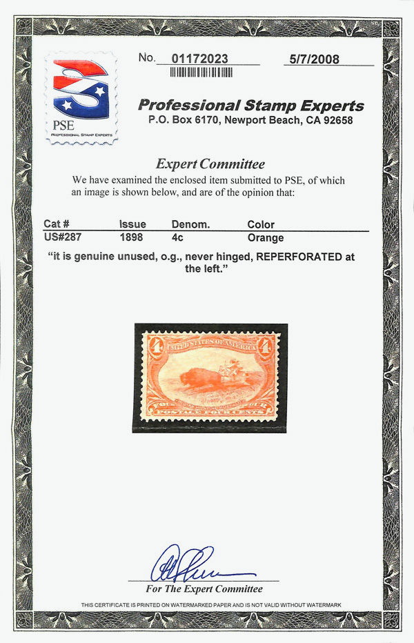 5087 nh 287 image1898, 4¢ Trans-Miss. (Scott 287), single, o.g., never hinged; Reperforated left side, Fine to Very Fine, with 2008 P.S.E. certificate.