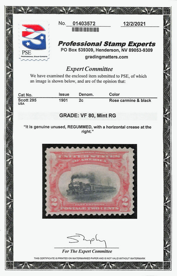 5093 ng 295 image1901, 2¢ Pan-American (Scott 295), single, regummed; Horizontal crease at the right, with 2021 P.S.E. certificate graded VF 80.