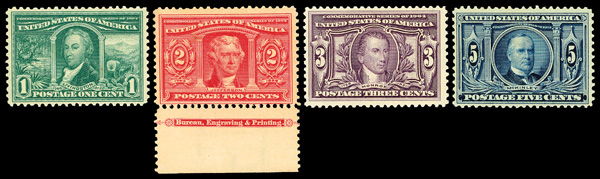 5108 nh 323-327 image1904, Louisiana Purchase complete (Scott 323-327), set of 5, o.g., 1¢-3¢ never hinged, 5¢ & 10¢ lightly hinged, rich colors, fresh and Fine to Very Fine, see the other 4 online.