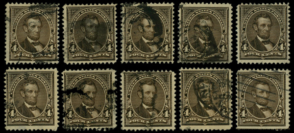 5081 O 269 image1895, 4¢ dark brown, D.L. watermark (Scott 269), lot of 10 examples, Fine to Very Fine.
