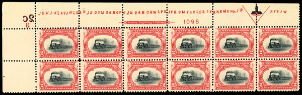 5094 ogbl 295 image1901, 2¢ Pan-American (Scott 295), top margin plate number 1098 block of 12 with imprint and running initials, o.g., lightly hinged, from the top left corner, sound and Post Office fresh with strong color, positions 2 & 8 never hinged, Fine.