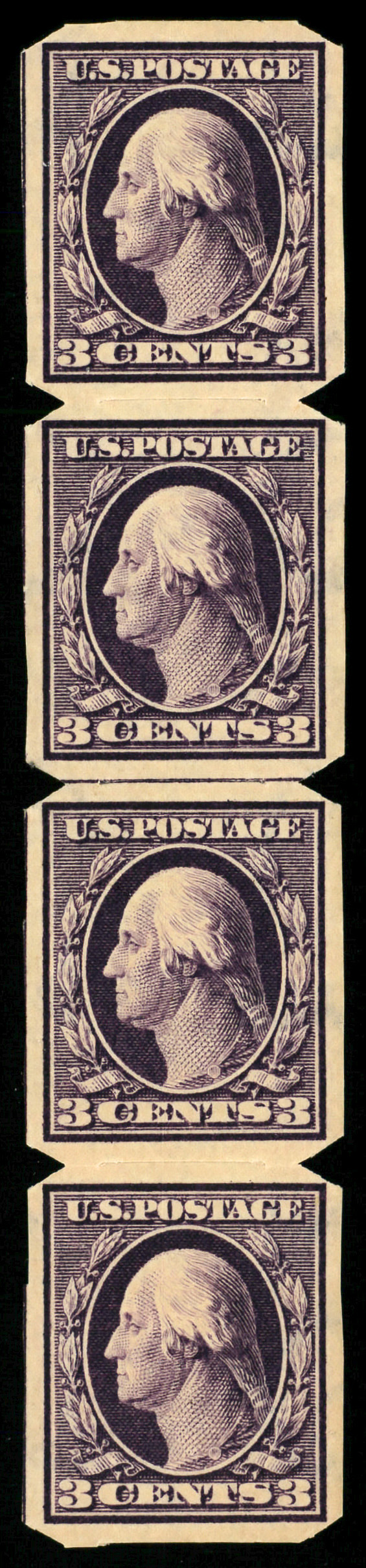 5120 og 345 image1909, 3¢ deep violet, type I, imperf., U.S. Automatic Vending, type I separations (Scott 345), guide line strip of 4, o.g., hinged, Very Fine to Extremely Fine.