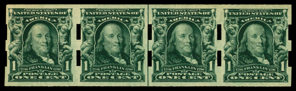 5119 nh/ogbl 343 image1908, 1¢ green, D.L. watermark, imperf. (Scott 343), block of 4 with horizontal guide line (3mm spacing), o.g., lightly hinged (2 stamps never hinged), Superb.