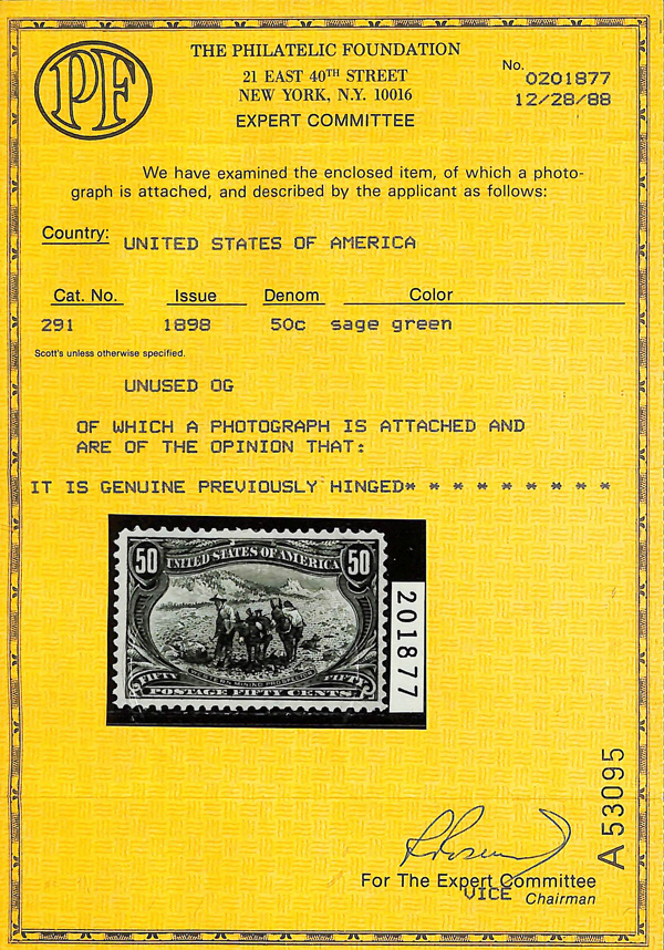 5089 og 291 image1898, 50¢ Trans-Miss. (Scott 291), Intense original hue, o.g., previously hinged, Very Fine, with 1988 P.F. certificate.