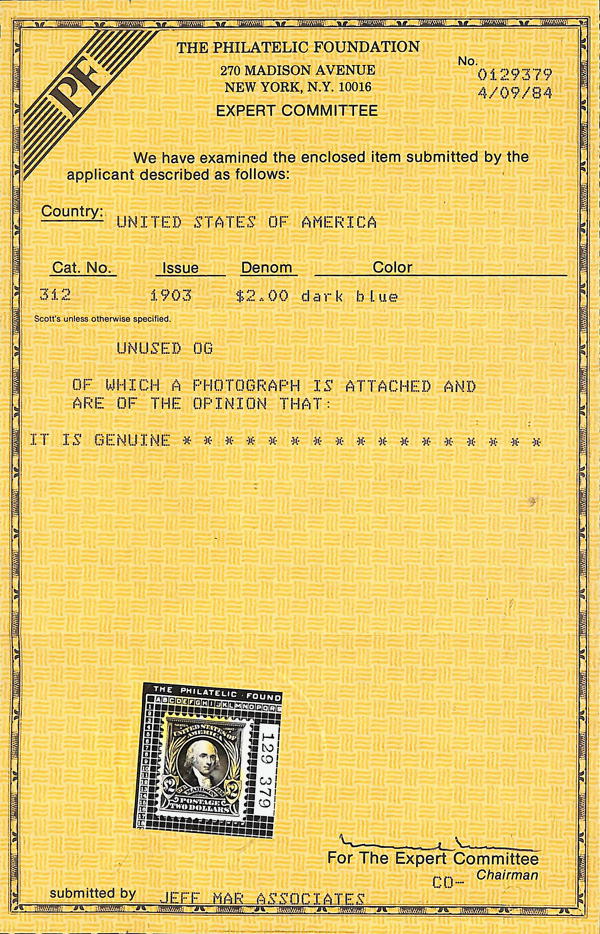 5104 og 312 image1903, $2 dark blue (Scott 312), Immaculate unused quality, o.g., hinged, Very Fine, with 1984 P.F. certificate.