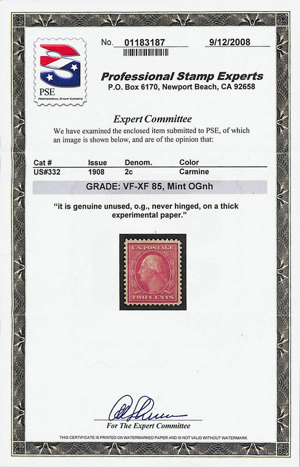 5116 nh 332 image1908, 2¢ carmine, D.L. watermark (Scott 332), on thick experimental paper, Razor-sharp print detail, o.g., never hinged, Very Fine to Extremely Fine, with 2008 P.S.E. certificate graded VF-XF 85. (Image) (Image2) (All Images)