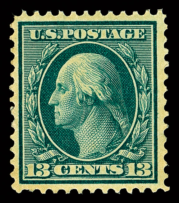 5118 og 339 image1909, 13¢ blue green, D.L. watermark (Scott 339), Crisp detail, o.g., previously hinged; short perf at bottom, Very Fine.