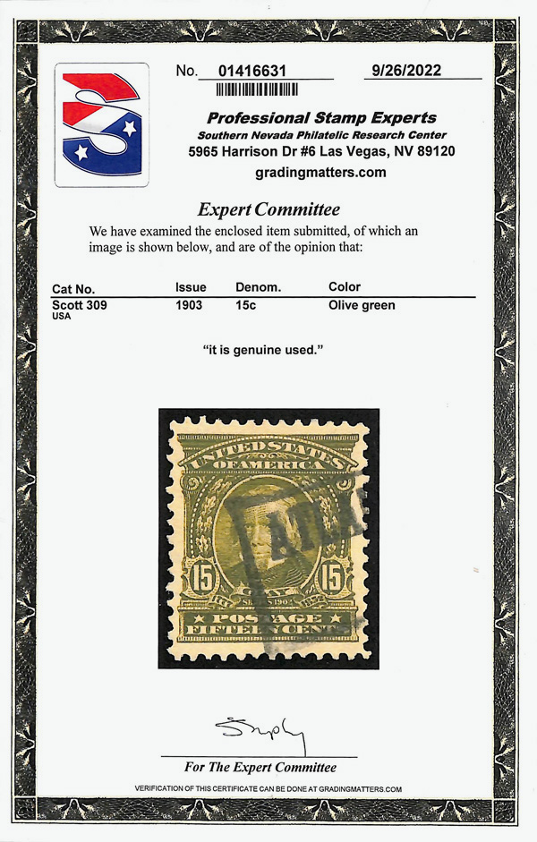 5103 O 309 image1903, 15¢ olive green (Scott 309), High-level preservation, Extremely Fine, with 2022 P.S.E. certificate.