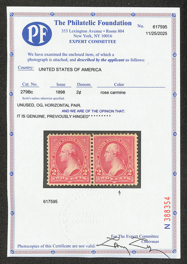 5083 og 279Bc image1898, 2¢ rose carmine, type IV (Scott 279Bc), o.g., hinged, with razor-sharp detail in enticing color, sound with three balanced margins (right wide), Fine to Very Fine, with 2025 P.F. certificate for pair, this position 2.