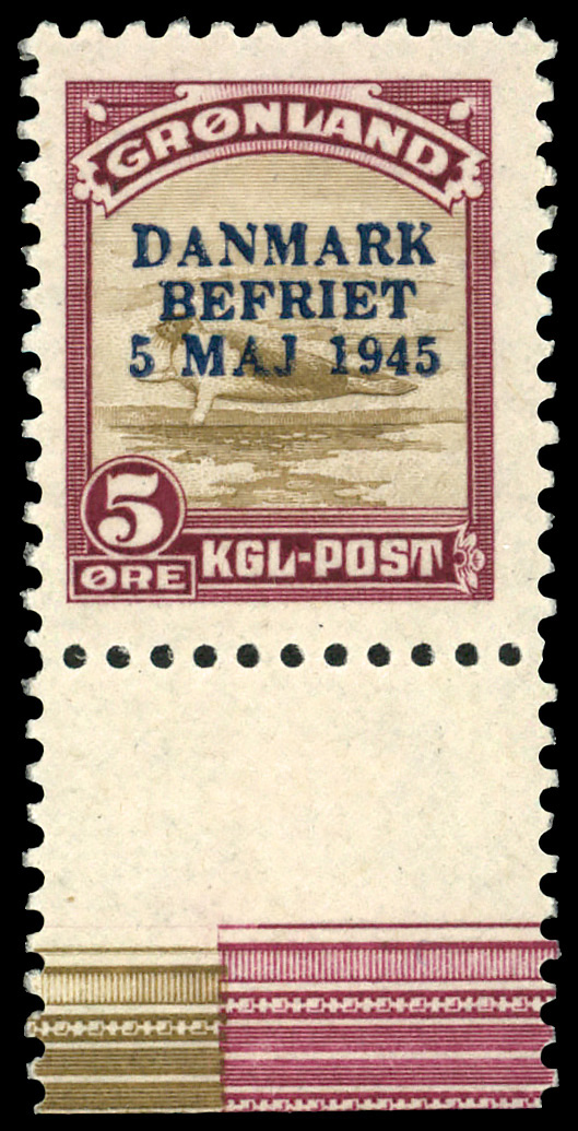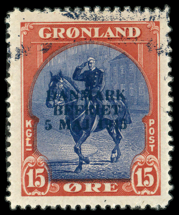6200 og 23a image1945, 15øre Liberation of Denmark, overprinted in blue (Scott 23a), single, o.g., hinged, Transference of blue overprint ink.