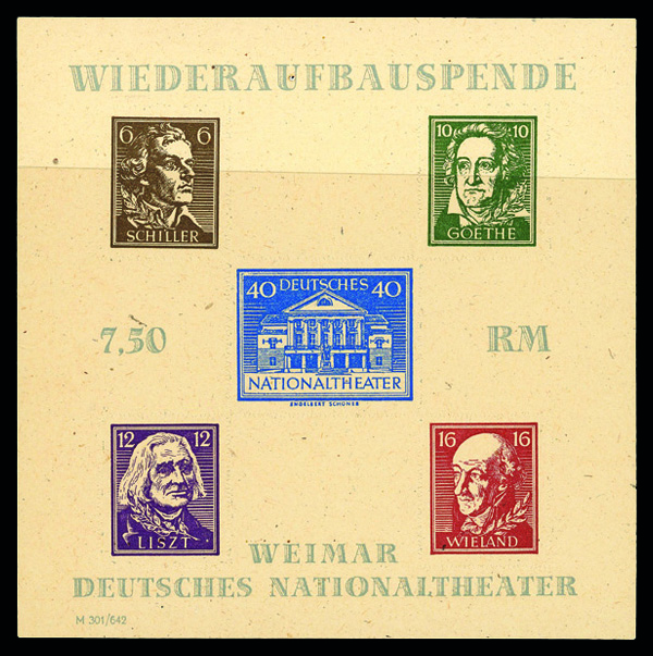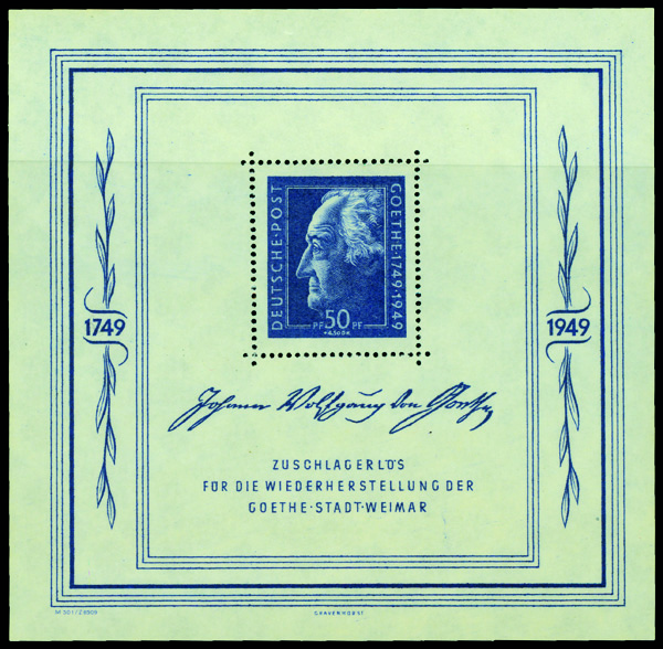 6191 nh 10NB11 image1949 Goethe souvenir sheet (Scott 10NB11), o.g., never hinged, Extremely Fine.