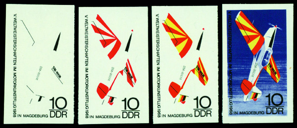 6172 P 1030 image1968, 10pf Stunt Plane, imperf. progressive color proofs (Scott 1030), set of 4, o.g., never hinged, Extremely Fine.