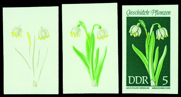 6175 P 1093 image1969, 5pf Spring Snowflake, imperf. progressive color proofs (Scott 1093), set of 3, o.g., never hinged, Extremely Fine.