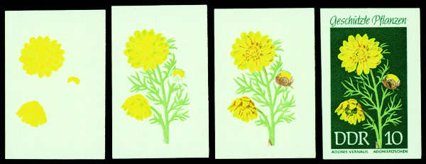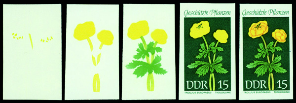 6177 P 1095 image1969, 15pf Globeflowers, imperf. progressive color proofs (Scott 1095), set of 5, o.g., never hinged, Extremely Fine.