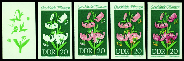 6178 P 1096 image1969, 15pf Garden Turk's Cap, imperf. progressive color proofs (Scott 1096), set of 5, o.g., never hinged, Very Fine to Extremely Fine.