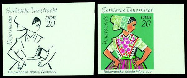 6182 P 1295 image1971, 20pf Hoyerserda Dance Costume, imperf. progressive color proof (Scott 1295), set of 2, o.g., never hinged, Very Fine to Extremely Fine.