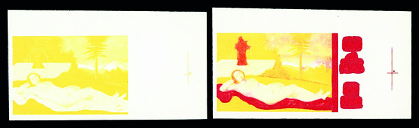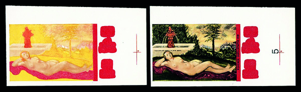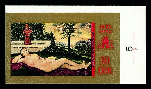 6184 P 1387 image1972, 70pf Cranach's Reclinig Nymph, imperf. progressive color proof (Scott 1387), set of 5, o.g., never hinged, Very Fine to Extremely Fine.