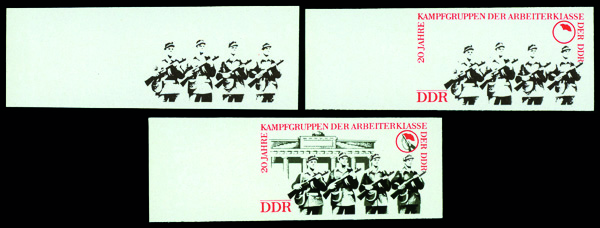 6187 P 1488 image1973, 20pf 20th Anniversary of the Worker's Militia, imperf. progessive color proofs (Scott 1488), set of 3, o.g., never hinged, Extremely Fine.