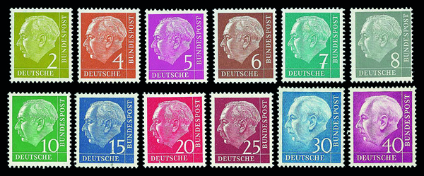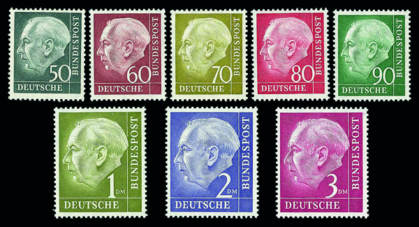6161 nh 702-721 image1953 Heuss complete (Scott 702-721), set of 20, o.g., never hinged, Very Fine to Extremely Fine.