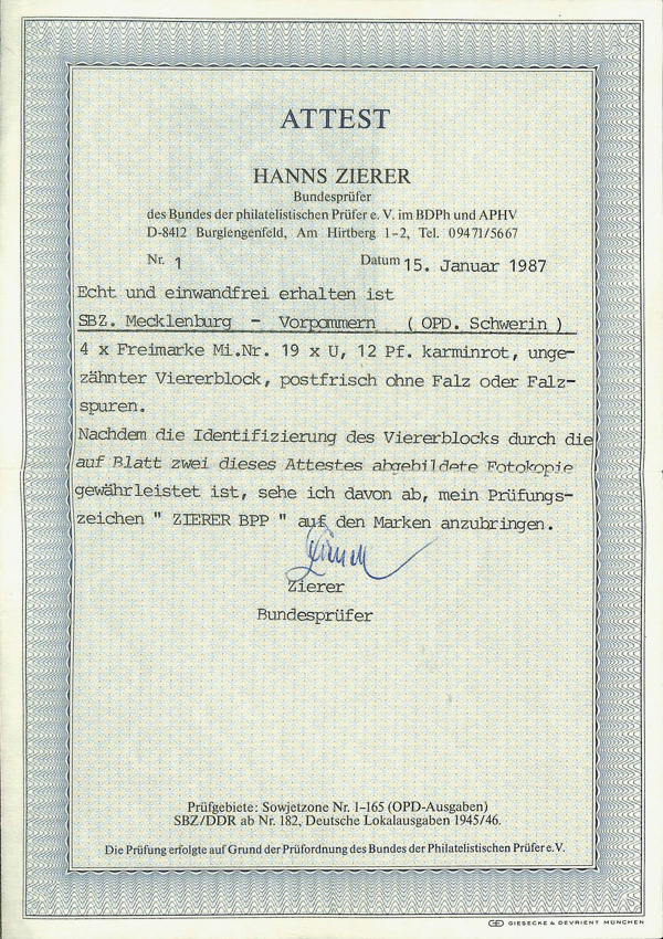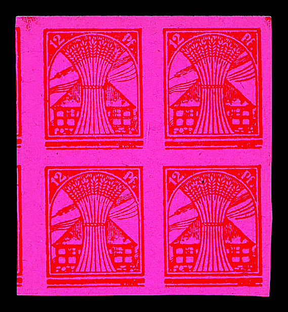 6192 nhbl 19 x u image1945, 12pf red on pink Grain & Farm House, imperf., block of 4, o.g., never hinged, Extremely Fine, with 1987 Zierer certificate.