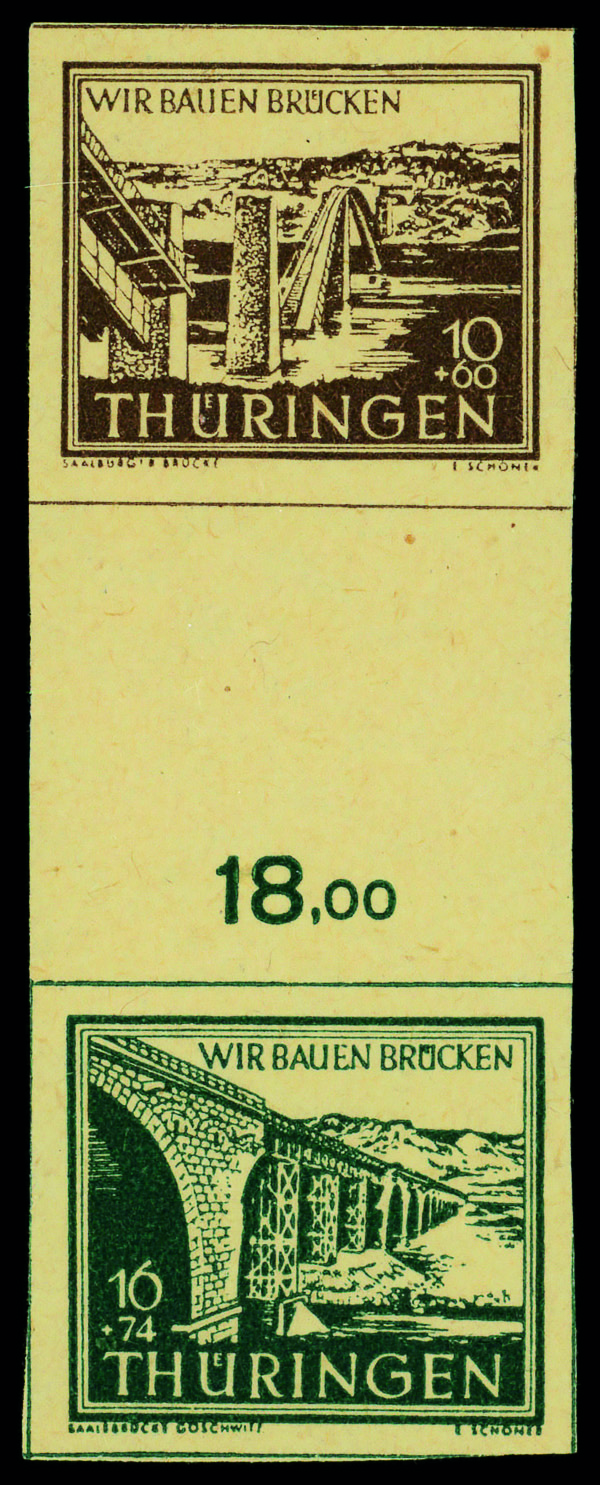 6198 nh S Zd 1 yy image1946, 10pf+60pf-16pf+74pf Saalburg Bridge & Saale Bridge, vertical pair with gutter between, o.g., never hinged, Extremely Fine.