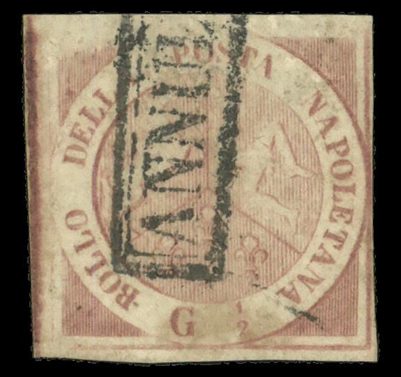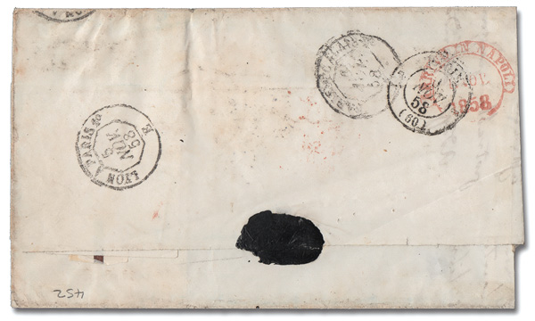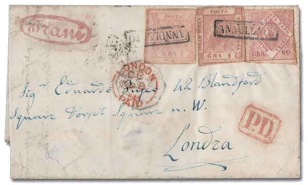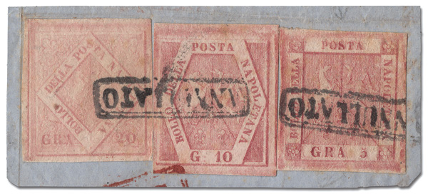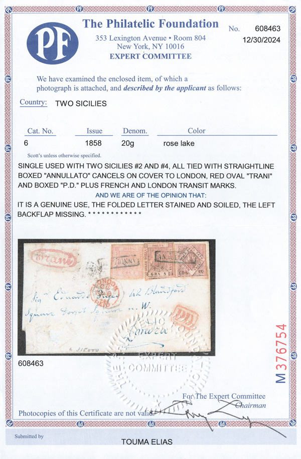 6214 cover 2, 4, 6 image1858, Arms, 1g pale lake, 5g brown lake & 20g rose lake (Scott 2, 4, 6), tied by boxed ANNULLATO handstamp on a folded cover from Naples, via France to London, England, in Nov 1858; all appropriate markings; somewhat stained/soiled, otherwise Fine to Very Fine. Scott prices just the 20g on cover at $2.900., with a 2024 P.F. certificate.