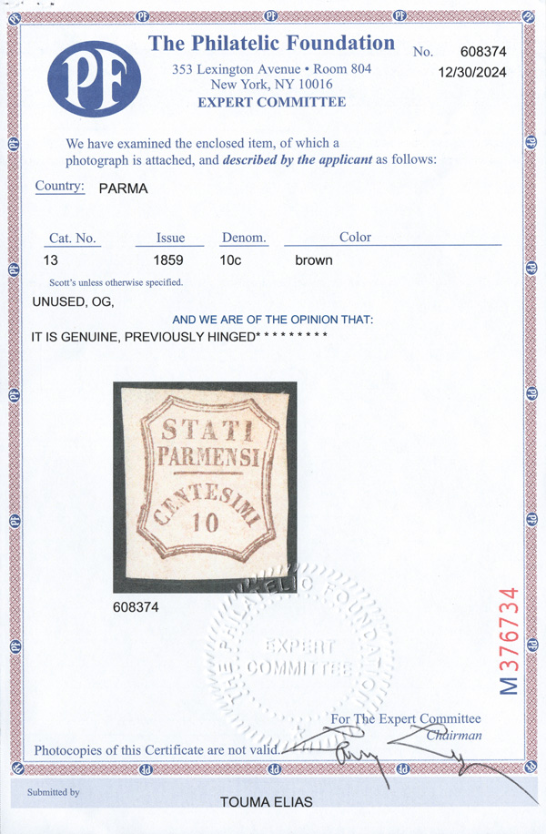 6208 og 13 image1859 Provisional Govt. 10c brown (Scott 13), o.g., lightly hinged, uncommonly fresh with large margins, Very Fine to Extremely Fine, signed A. Brun, with a 2024 P.F. certificate.