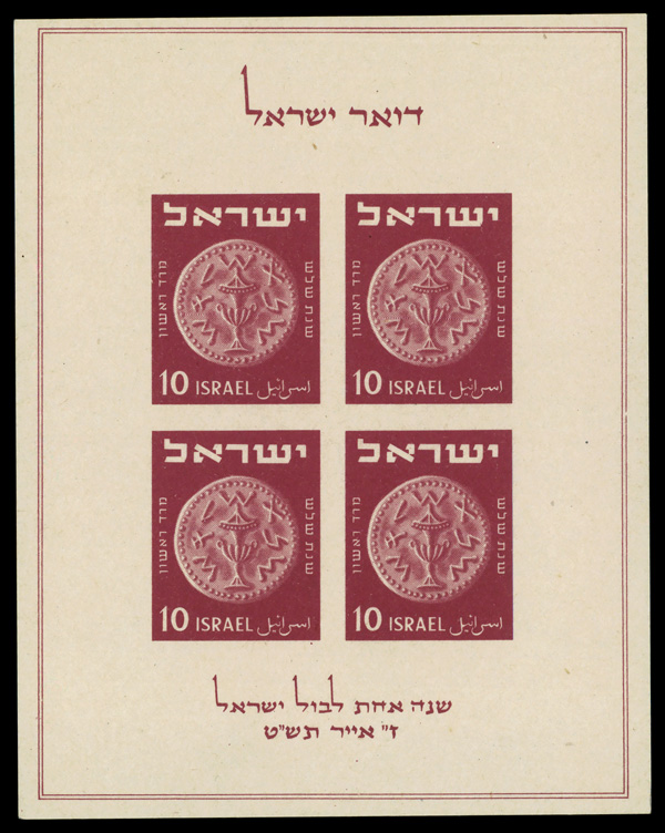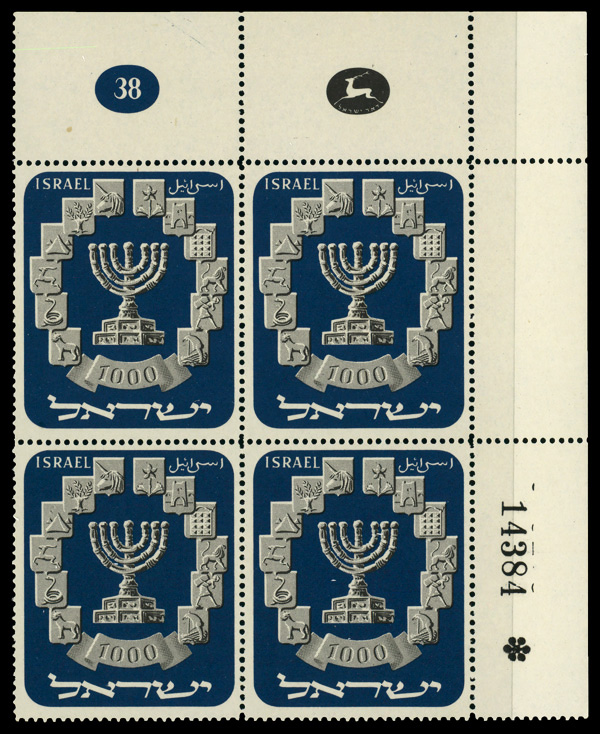 6207 nhbl 55 image1952, 1000p Menorah (Scott 55), plate block of 4, o.g., never hinged, Very Fine.