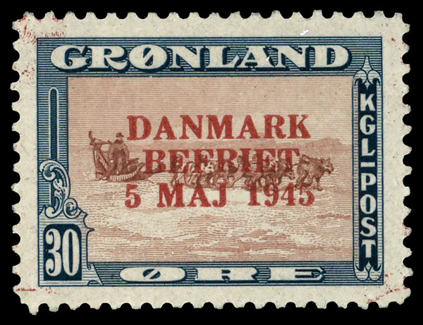 6201 og 24a image1945, 30øre Liberation of Denmark, overprinted in carmine (Scott 24a), single, o.g., hinged, Fine to Very Fine.