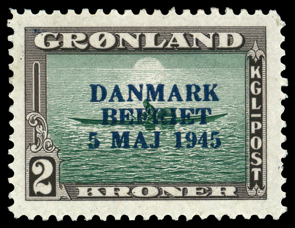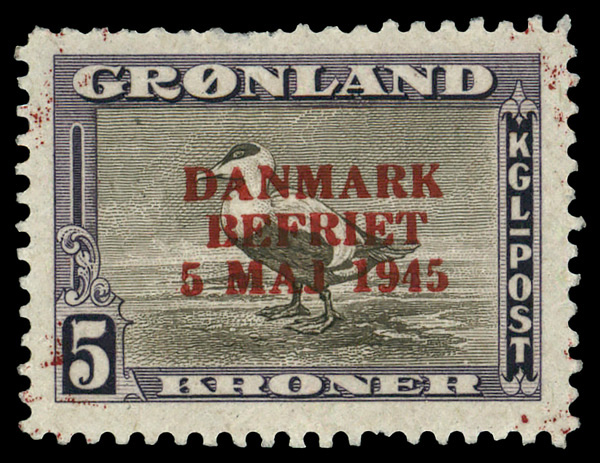 6203 og 27a image1945, 5kr Liberation of Denmark, overprinted in carmine (Scott 27a), single, o.g., hinged, Fine to Very Fine.