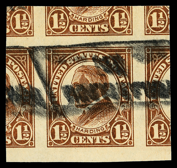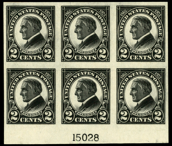 5224 nhbl 611 image1923, 2¢ Harding, imperf. (Scott 611), plate block of 6, o.g., never hinged, Very Fine to Extremely Fine.