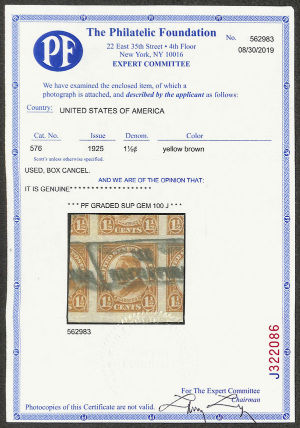 5216 O 576 image1925, 1½¢ Harding, imperf. (Scott 576), box cancel, with 2019 P.F. certificate graded GEM 100J.