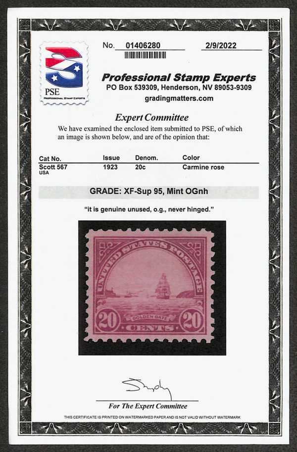 5206 nh 567 image1923, 20¢ Golden Gate (Scott 567), unusually large margins, o.g., never hinged, Extremely Fine to Superb, with 2022 P.S.E. certificate graded XF-SUP 95.