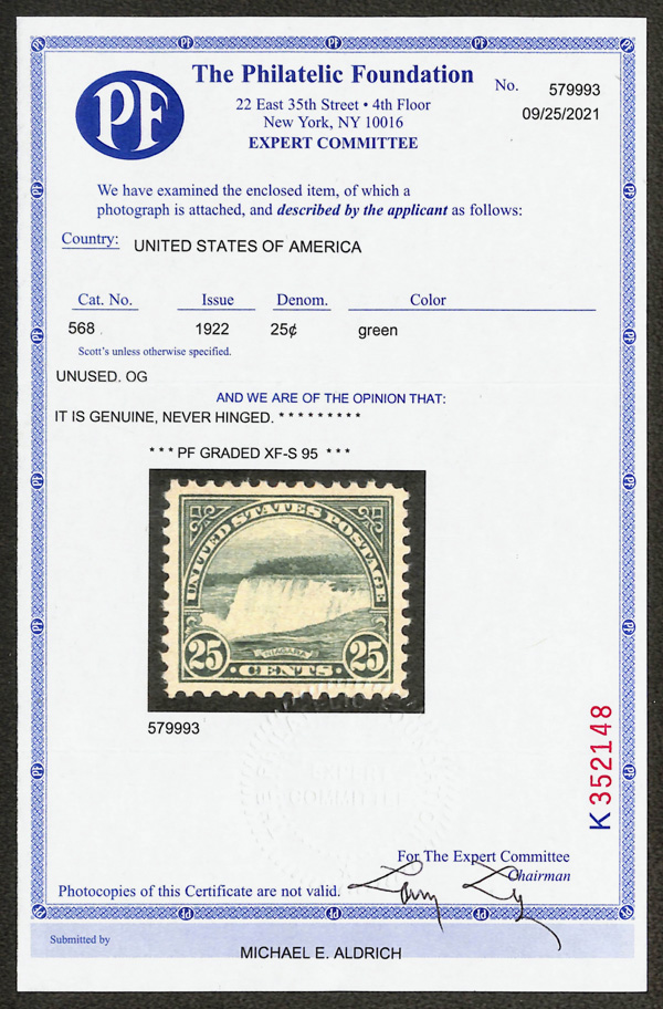 5208 nh 568 image1922, 25¢ Niagara Falls (Scott 568), perfect design sharpness, o.g., never hinged, Extremely Fine to Superb, with 2021 P.F. certificate graded XF-SUP 95.