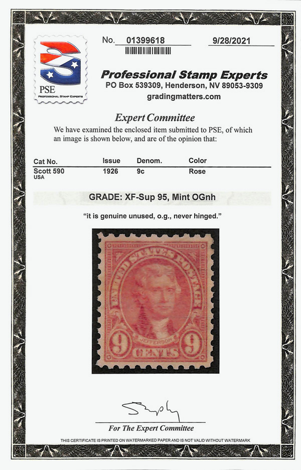 5221 nh 590 image1926, 9¢ Jefferson, rotary press printing, perf. 10 (Scott 590), brilliantly fresh example, o.g., never hinged, Extremely Fine to Superb, with 2021 P.S.E. certificate graded XF-SUP 95.