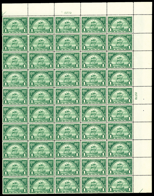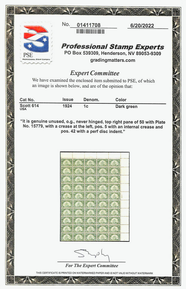 5226 nhbl 614 image1924, 1¢ Huguenot-Walloon (Scott 614), top right full pane of 50 with plate number F15779, o.g., never hinged, attention-grabbing with intense color on immaculate paper; crease at left, position 5 with internal crease, position 42 with perforation disc indent, Fine to Very Fine, with 2022 P.S.E. certificate.