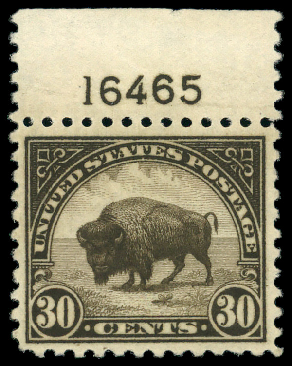 5209 nh 569 image1923, 30¢ American Buffalo (Scott 569), plate number single, o.g., never hinged, Very Fine to Extremely Fine. (Image) Suggested Bid $48