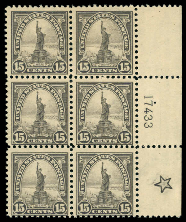 5205 ogbl 566 image1922, 15¢ Statue of Liberty (Scott 566), plate block of 6 with 5-point star, o.g., hinged, Fine.