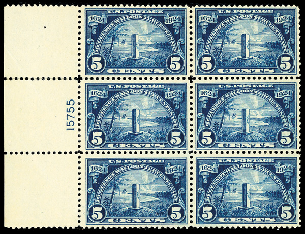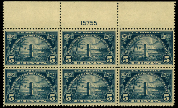 5228 nhbl 616 image1924, 5¢ Huguenot-Walloon (Scott 616), top margin plate block of 6, Gorgeous freshly printed look, o.g., never hinged; minor perf separations at top, Very Fine to Extremely Fine centering.