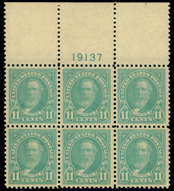 5201 nhbl 563 image1922, 11¢ Hayes (Scott 563), top margin plate block of 6, Well-preserved color strength, o.g., never hinged; gum skip down center stamps, Very Fine.